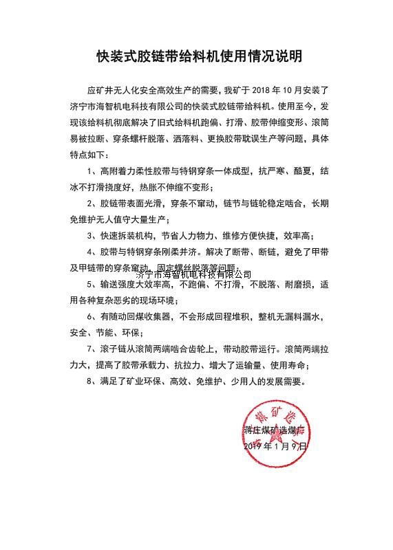 快裝式膠鏈帶給料機可實現(xiàn)完美替代物料運輸系統(tǒng)在用的所有形式的給料機,包括甲帶給料機、帶式給料機、振動給料機、往復(fù)式給料機、鏈板給料機等,膠鏈帶給料機更好的解決了跑偏、打滑、換裝困難等問題,更利于實現(xiàn)快速裝車、高效自動化的現(xiàn)代智能運輸系統(tǒng)要求。