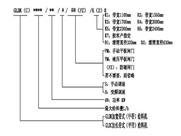 加寬加長(zhǎng)帶式(甲帶)給料機(jī)型號(hào)說(shuō)明: