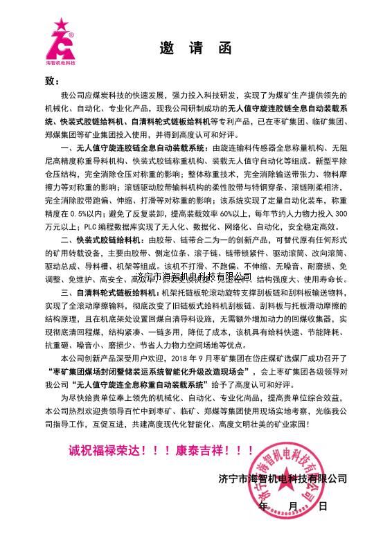 本公司創(chuàng)新產(chǎn)品深受用戶歡迎,2018年9月棗礦集團(tuán)在岱莊煤礦選煤廠成功召開(kāi)了“棗礦集團(tuán)煤場(chǎng)封閉暨儲(chǔ)裝運(yùn)系統(tǒng)智能化升級(jí)改造現(xiàn)場(chǎng)會(huì)”,會(huì)上棗礦集團(tuán)各級(jí)領(lǐng)導(dǎo)對(duì)我公司“無(wú)人值守旋連全息稱重自動(dòng)裝載系統(tǒng)”給予了高度認(rèn)可和好評(píng)。